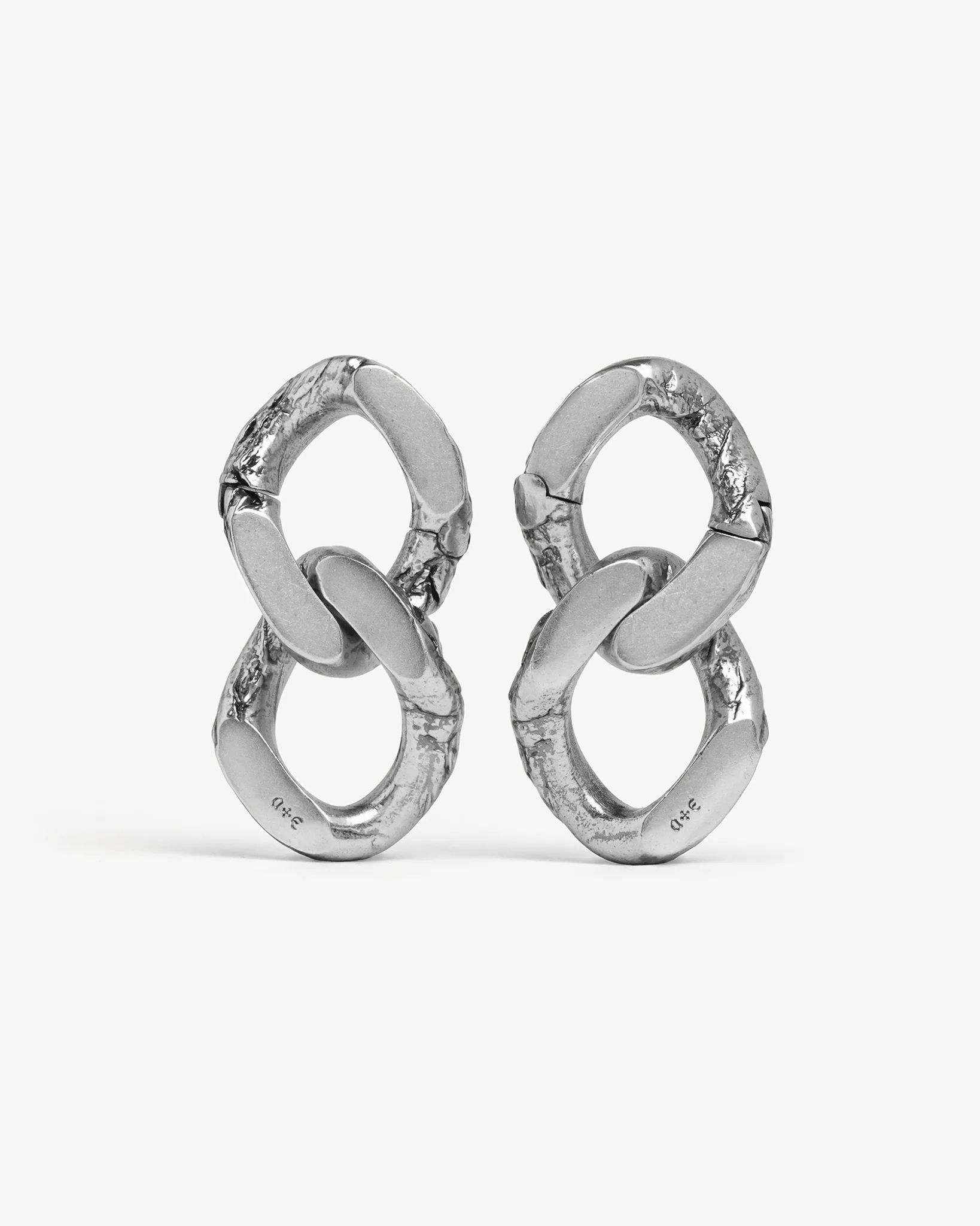 Find grunge infinity in a shackled flux. Hangers consisting of two connected links of a curb chain marked with rugged textures. Charged with a genderless appeal, making this a true crowd favourite.