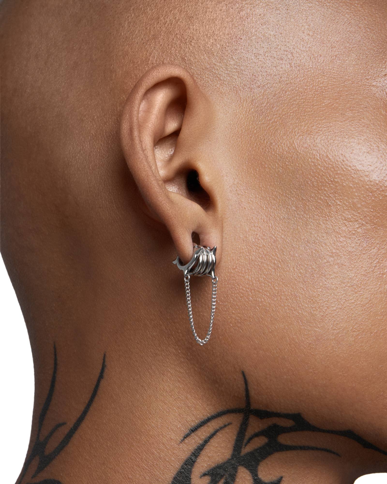 Ring stacks featuring twin spindle-spurred halos bound by a kinetic chain. Wear this piece between your favourite ring stacks to build a layered, textured statement. Forged entirely from 316L stainless steel for all genders and expressions. Complete your look with other jewelry from the FORSAKEN series.