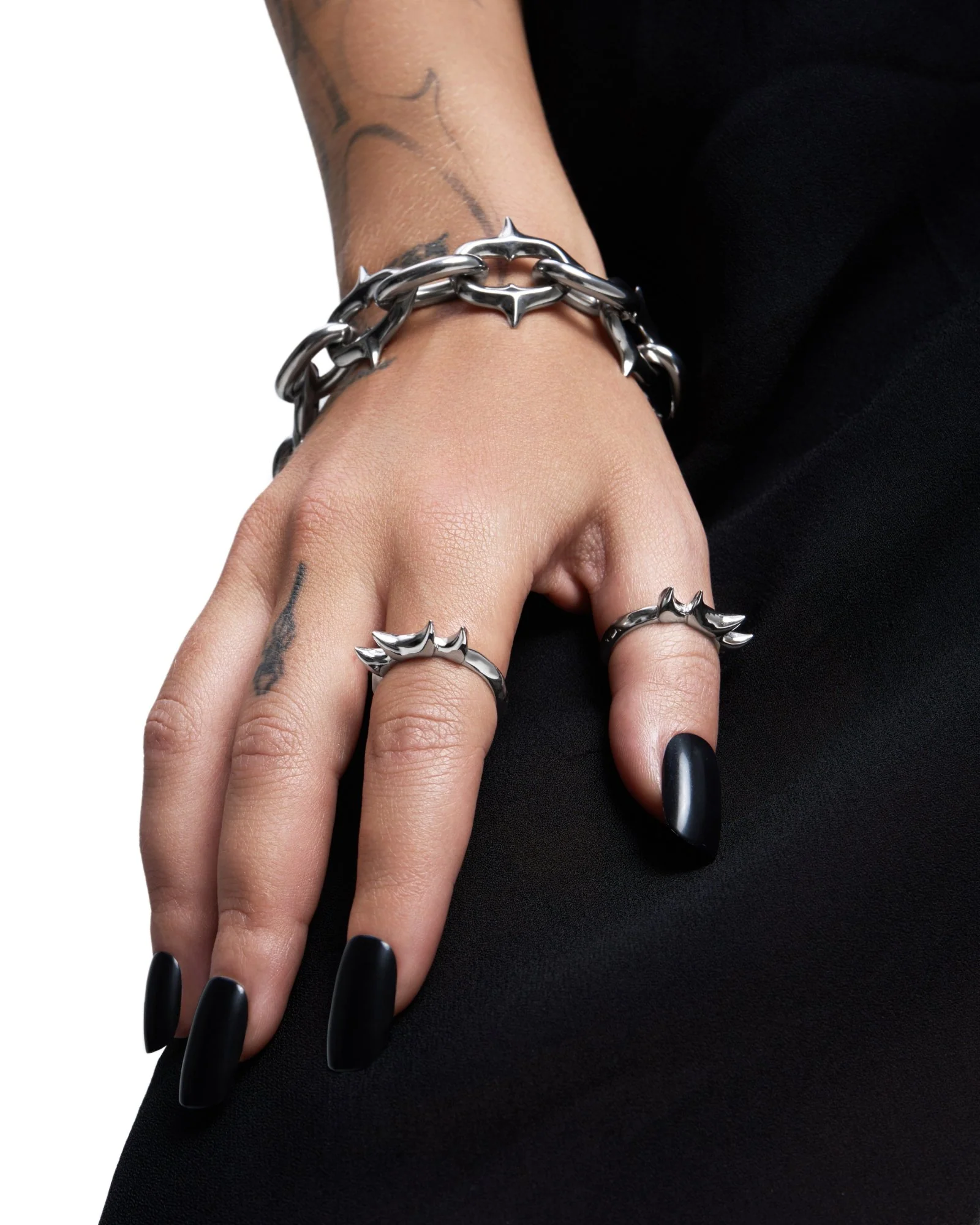 A demi-fine 925 sterling silver ring featuring four curved peaks at its crest. Finished with a timeworn texture and crafted for a versatile fit that flatters every finger, from pinky to thumb. Wear solo for singular impact, or stack 2 to 3 for a snarled, spiral statement. Forged for all genders and expressions. Complete your look with other jewelry from the FORSAKEN series.