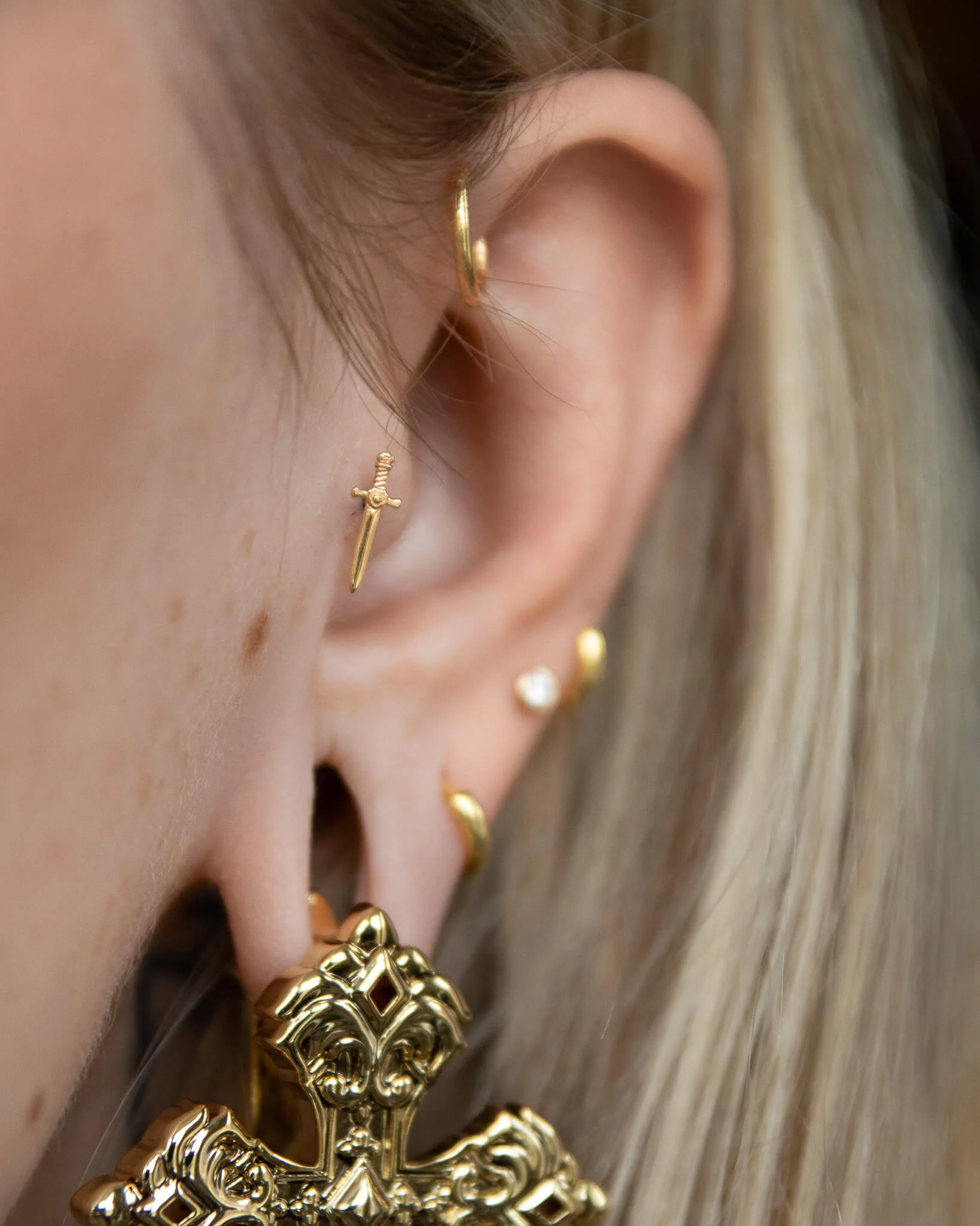 A 14k gold stud topped with a sword figure. Ones to add to your jewelled armoury or to take into fierce fights alone.Demi-fine alternative jewelry to adorn your soul.