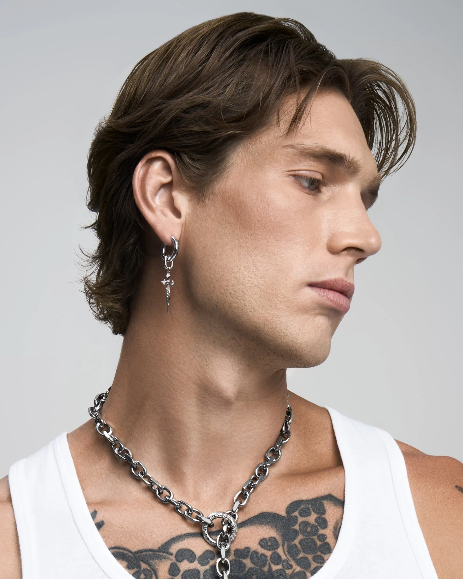 A smaller, demi-fine set of dangle earrings made entirely from 925 sterling silver, featuring a removable gothic cross derived from our Ask and Embla logomark. Shop the Illyria series.