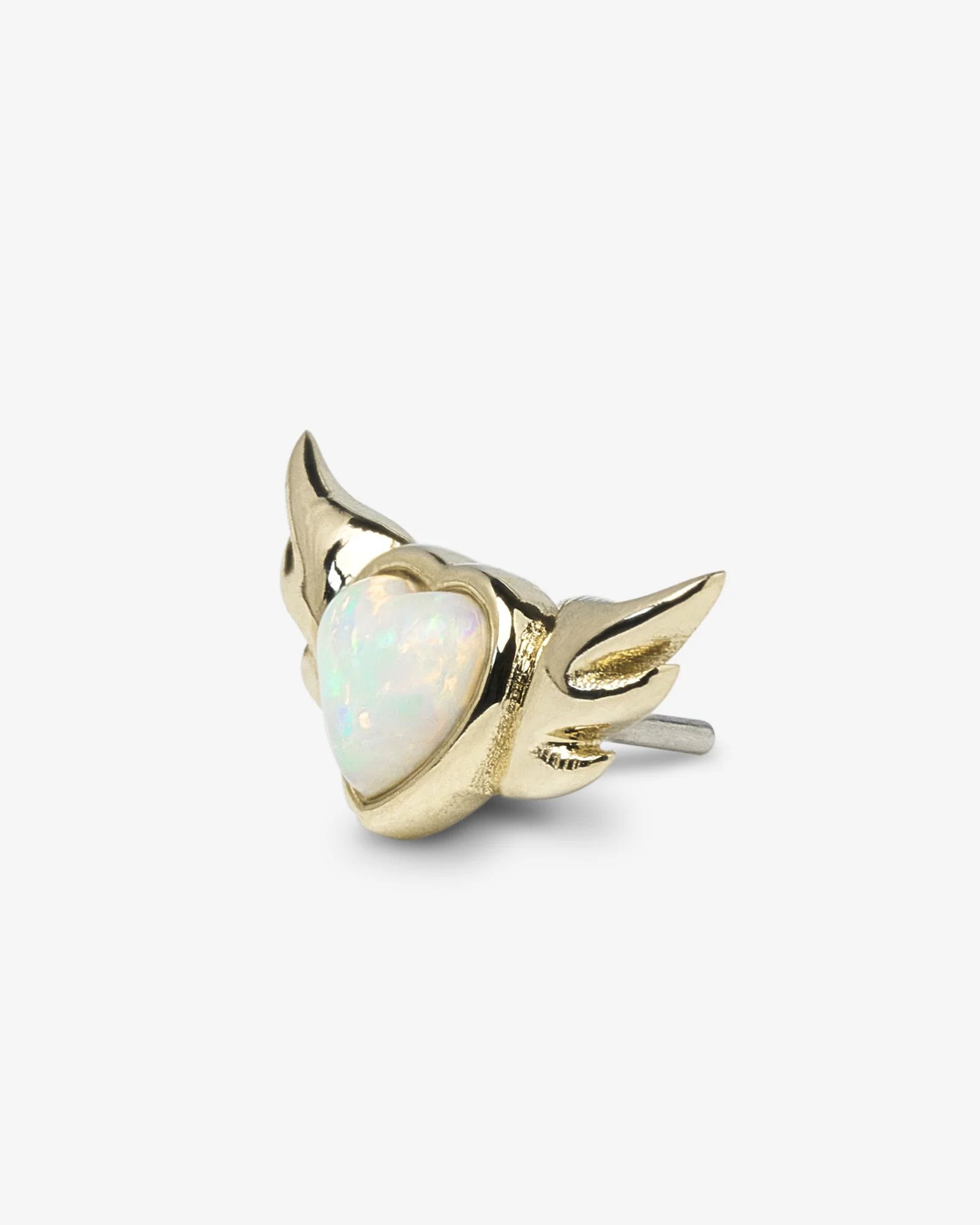 By golden glory and opulent independence, freedom takes flight in zealous iridescence. A solid 14K Gold threadless end of a heart with wings framing an opaline centre. Demi-fine alternative jewelry to adorn your soul.