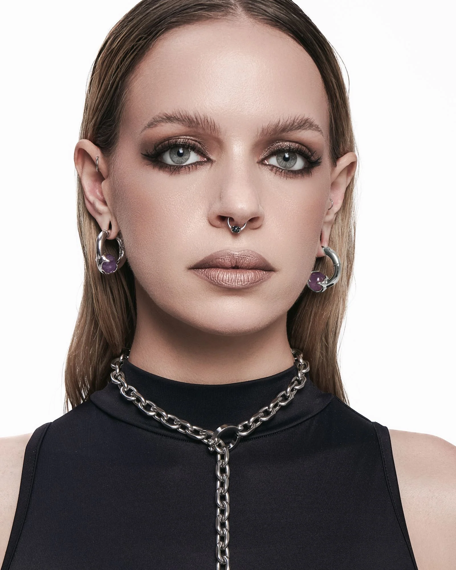 Hangers featuring a spherical amethyst gemstone cradled within silver crescent-shaped accents. Forged for all genders and expressions. Complete your look with other jewelry from the Nebula series.