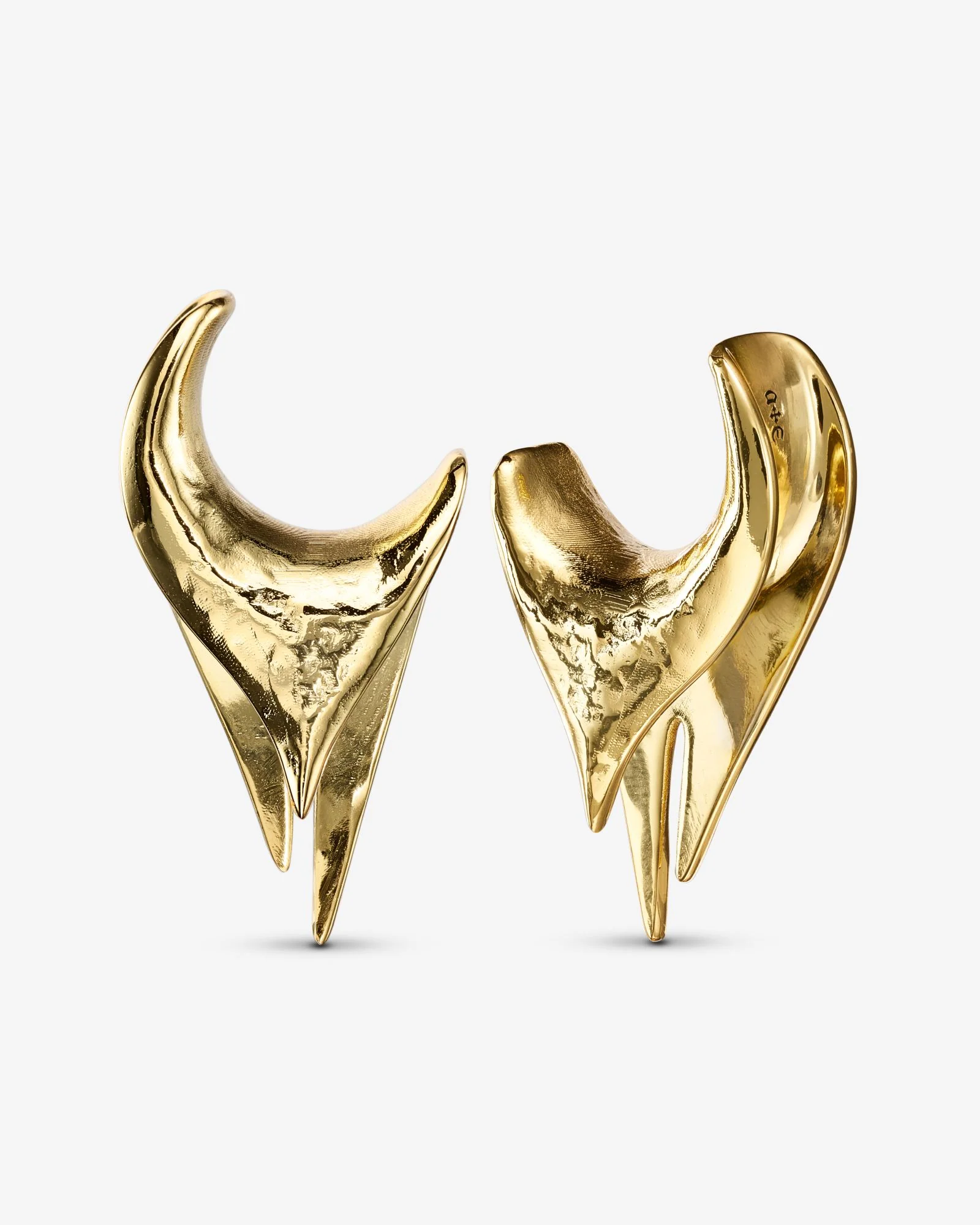 Reversible, high-polished saddle hangers featuring pointed shards of varying lengths on their front and back. Wear it front-facing for a bolder, curved cut, or wear it backwards for a subtler, sharded style. Burnished all around with a time-honoured texture.